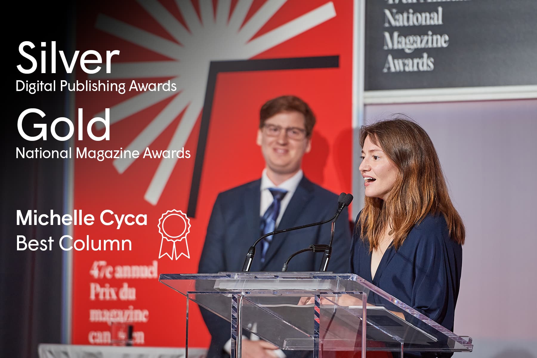 The Walrus contributing writer Michelle Cyca took home Silver at the Digital Publishing Awards and gold at the National Magazine Awards for her columns. The Walrus also won additional silver awards for fiction by Claire Cameron; a profile on Alanis Obomsawin by Zoe Heaps Tennant; Eamon MacMahon’s photo essay “Bombs, Bullets, and Endangered Birds”; and our May 2023 cover, “Did You Know This Was a Graveyard?”