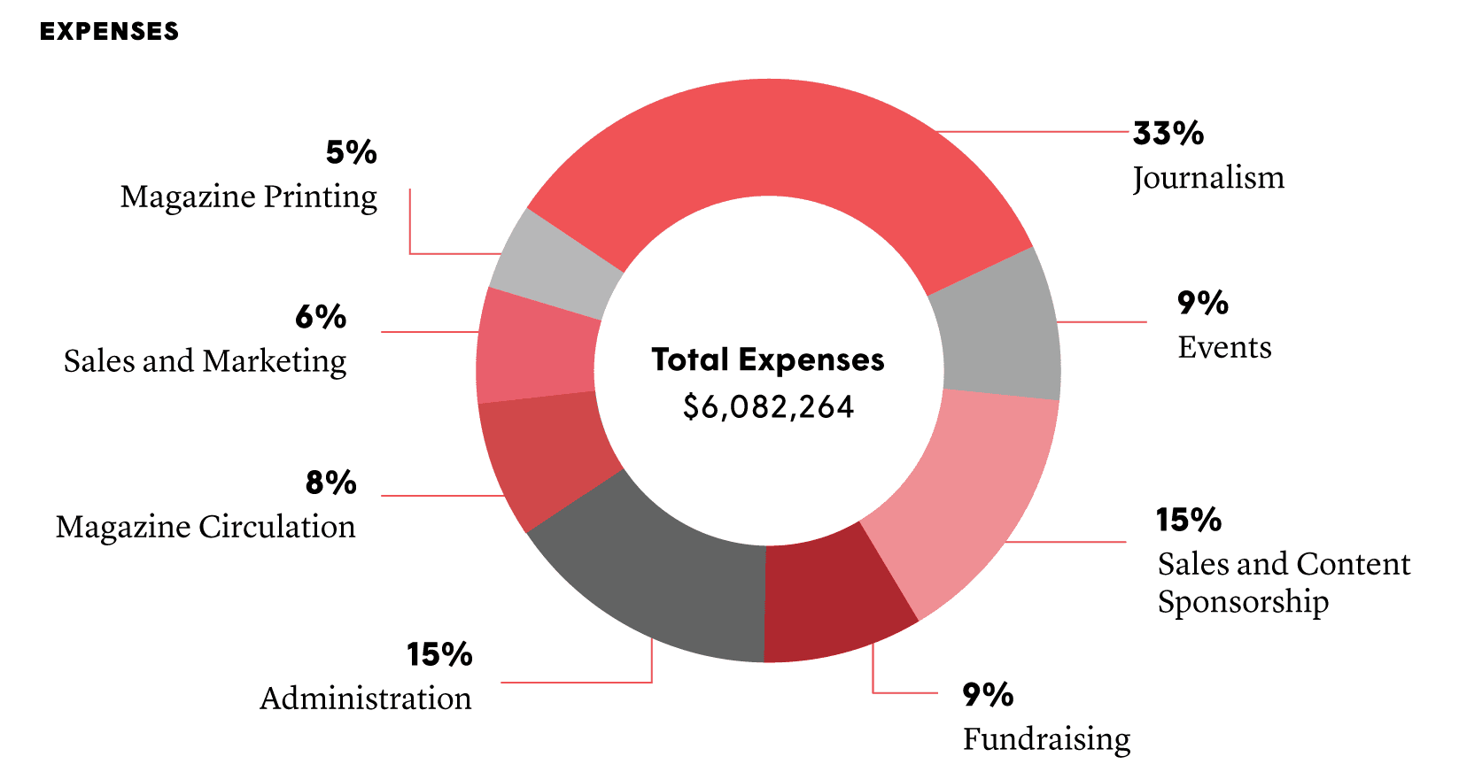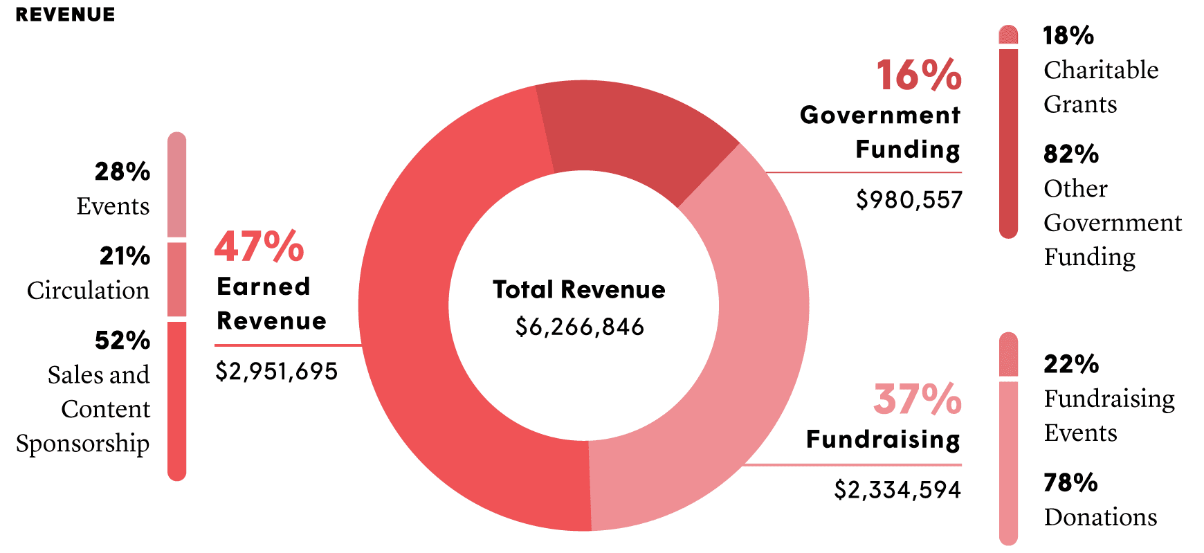 The economic reality of a mid-sized charity today is characterized by volatility and a rapidly changing social environment. The Walrus’s mixed revenue model—made up of philanthropy, event sponsorship, client revenue, government grants, advertising, and circulation—means that we are oftentimes able to adapt to fluctuations in any one area by increasing our focus on others.